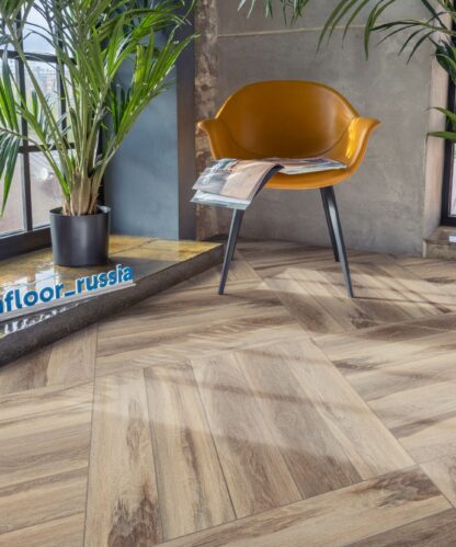 AquaFloor Space Parquet Light выполнен в виде елочки, что придает полу элегантный и современный вид. Благодаря наличию фаски, покрытие выглядит еще более реалистично и объемно, создавая ощущение настоящего деревянного паркета.